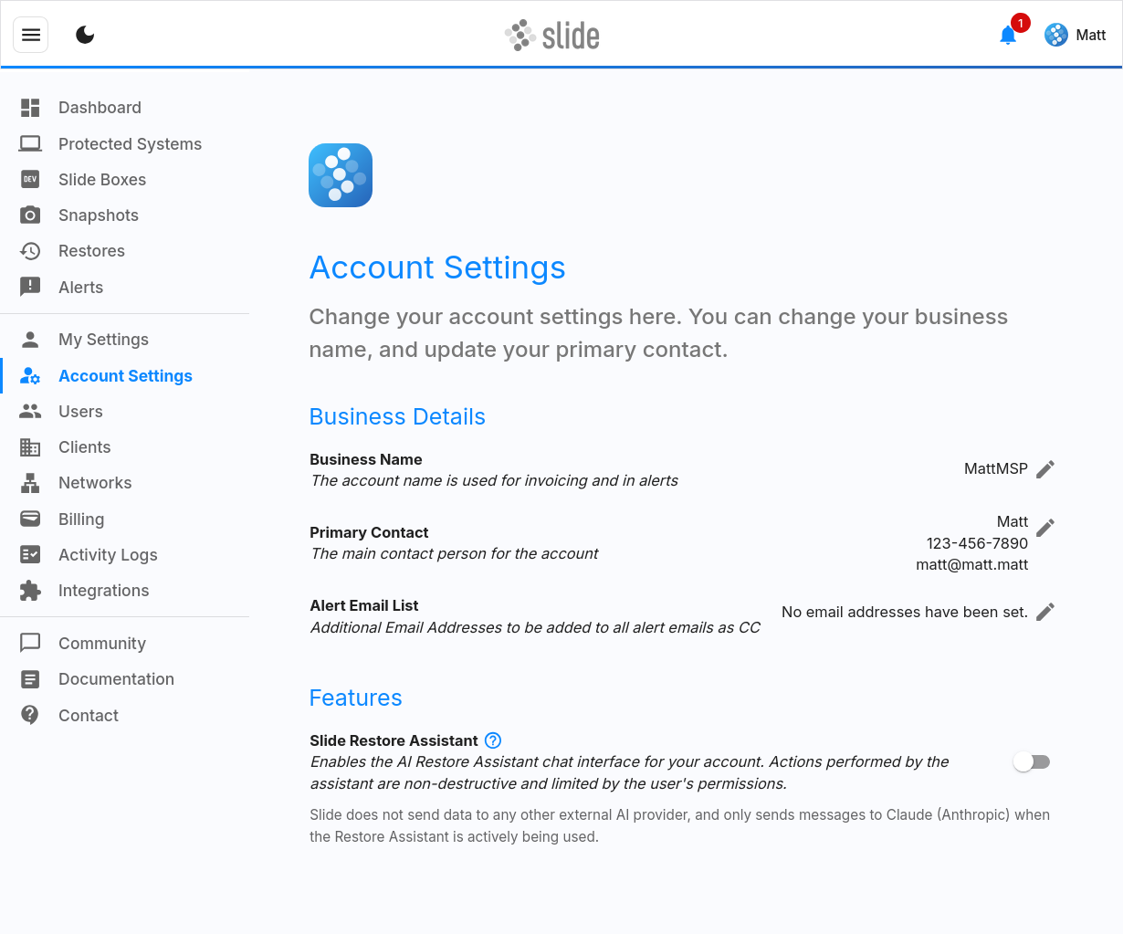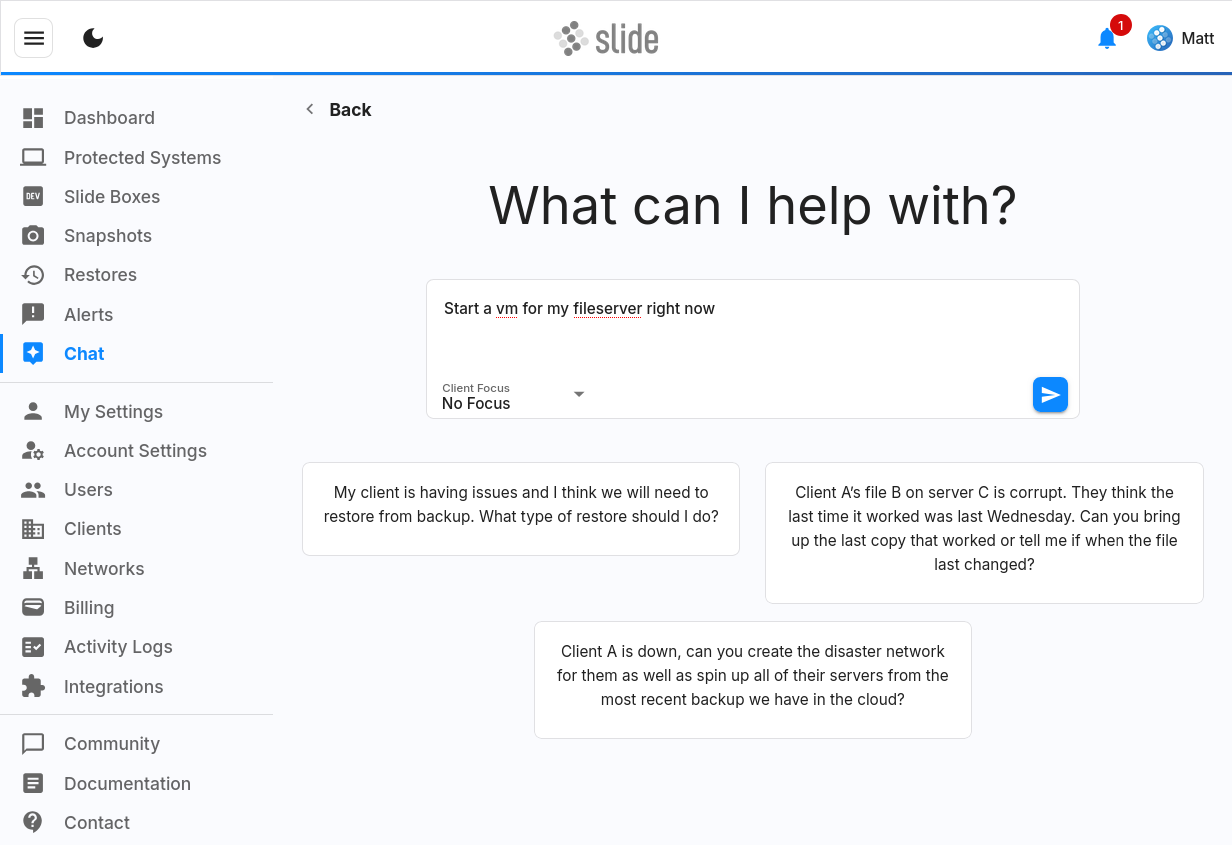 The Chat page allows you to talk with the AI-powered Slide Restore Assistant. It can do things like create restores, find files in snapshots, and answer your questions about Slide.