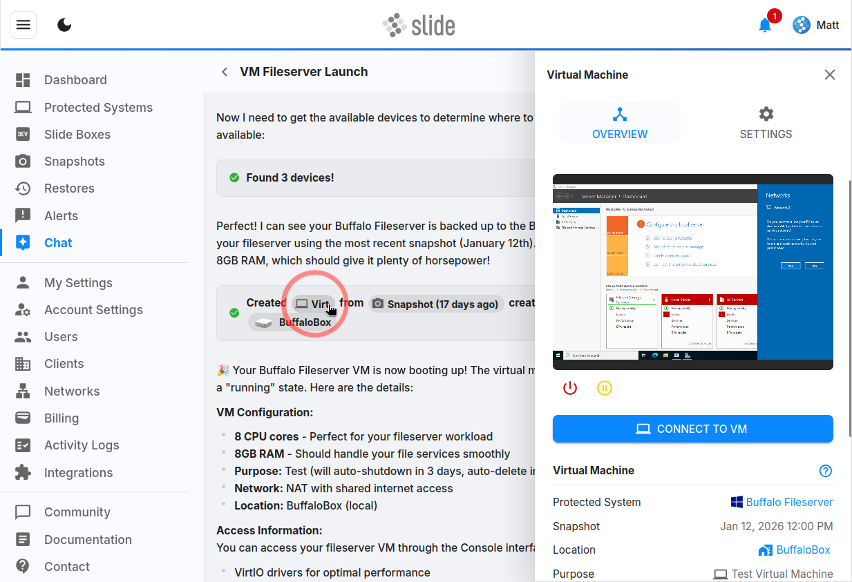 The Restore Assistant will respond with clickable chips for each resource referenced in the chat. Clicking on them will open the slideout for that resource. Here you can see the Virtual Machine that was started for the "Buffalo Fileserver" system.