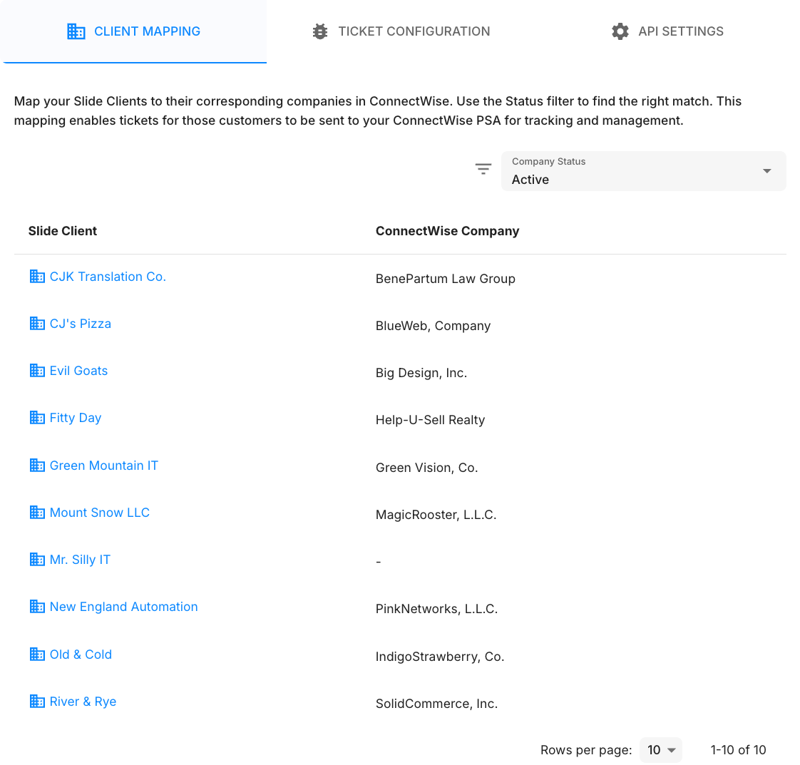 After your integration is configured and saved, you can begin mapping your ConnectWise companies to Slide clients. As part of reconciling your company data, the integration automatically attempts to fuzzy match ConnectWise company names to Slide clients. You should review and update these mappings as needed.
