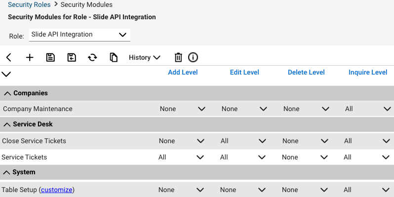 To ensure the Slide integration has appropriate permissions, create a dedicated security role in ConnectWise Manage. It is critical that this role has the necessary permissions listed below.