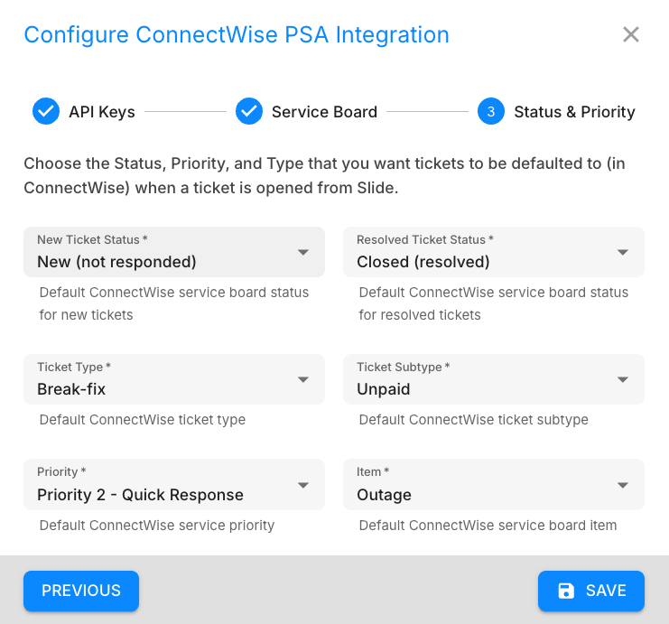 The Slide ConnectWise PSA integration enables bidirectional synchronization between Slide and your ConnectWise PSA. It automatically creates service tickets from Slide alerts, syncs company data, and maintains ticket status synchronization across both platforms.