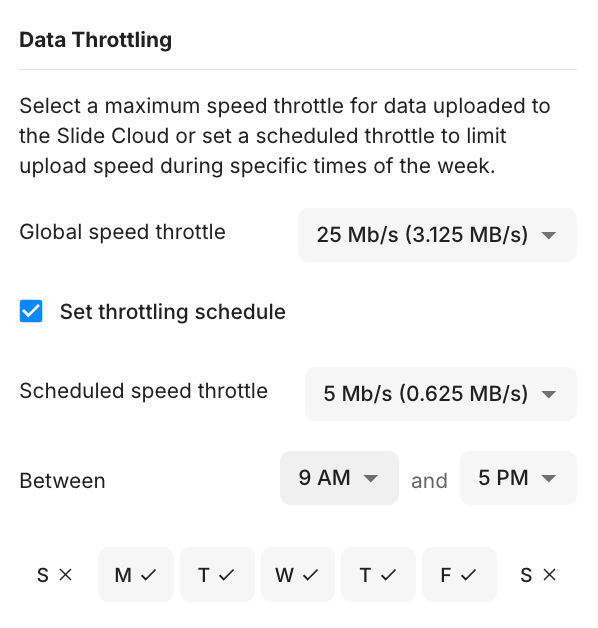 - Data Throttling: Control the amount of bandwidth that can be used to send data to the Slide cloud.