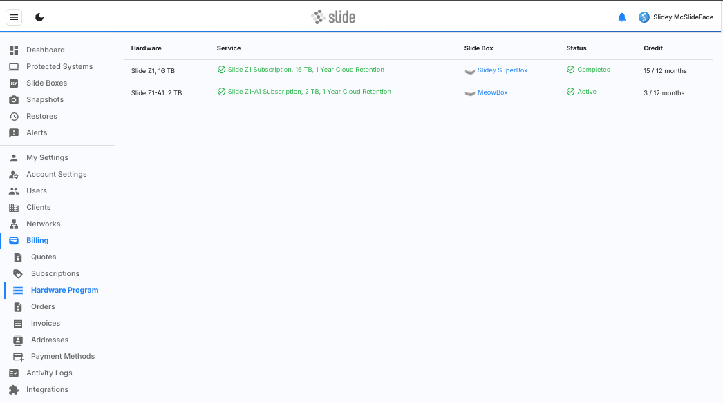 You can view and manage Free to Own devices directly in the Slide Console. From the Console, navigate to your Hardware Program page where each device enrolled in Free to Own will display: