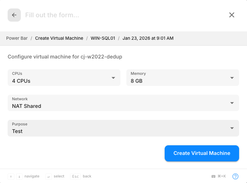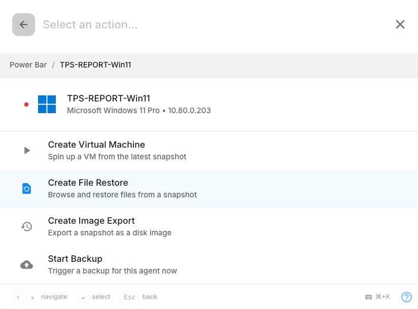 Spin up a virtual machine from any snapshot for disaster recovery testing or data access. The Power Bar guides you through: