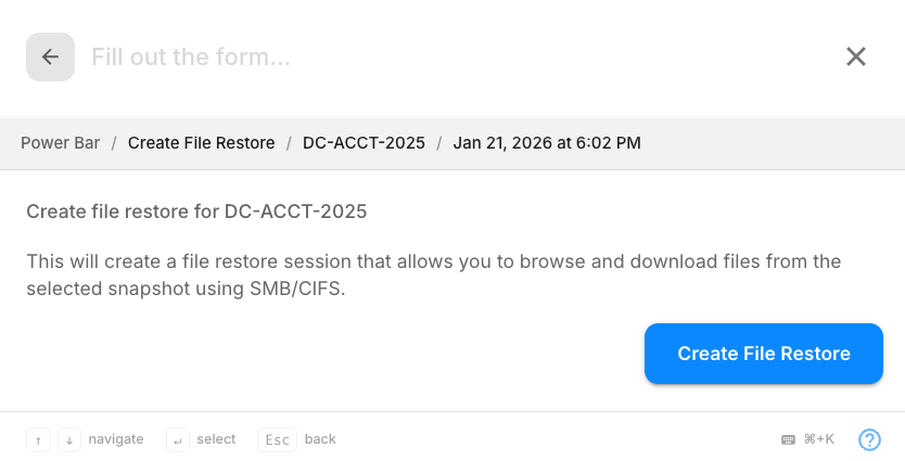 Type file, files, browse, smb, or restore to quickly find the Create File Restore action.