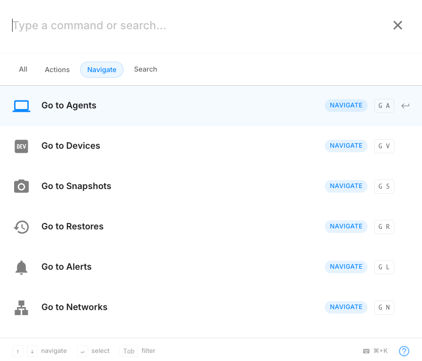 Navigation shortcuts use G as a leader key. Press G followed by the second key to navigate directly without opening the Power Bar.