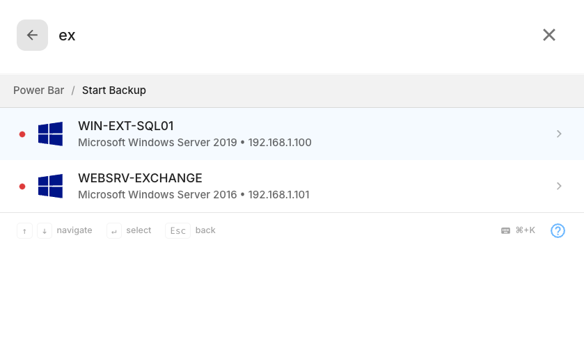 Trigger an immediate backup for any protected system. After selecting "Start Backup", choose the agent you want to back up.